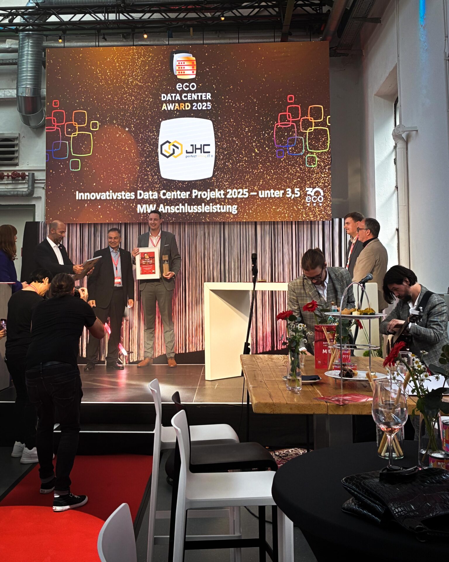 Im stilvollen Ambiente des alten Auktionshauses in Mainz fand am Montagabend die Preisverleihung für den Data Center Award 2025 statt. Der Preis wird vom eco – Verband der Internetwirtschaft e.V. verliehen und würdigt wegweisende Innovationen im Bereich Data Center und gibt führenden Projekte der Branche eine Bühne. Julian Hauber setzte sich mit seinem Unternehmen JH-Computers mit dem eigenen innovativen Betriebskonzept, der konsequenten Nachhaltigkeit und der hohen Energieeffizienz gegen die starke Konkurrenz durch und überzeugte sowohl Jury als auch Publikum.